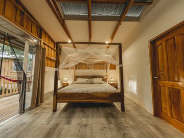 Cama King y terraza privada. Baño y ducha. Aire acondicionado. Refrigeradora. Precio para una o dos personas. Cargo adicional por persona extra.